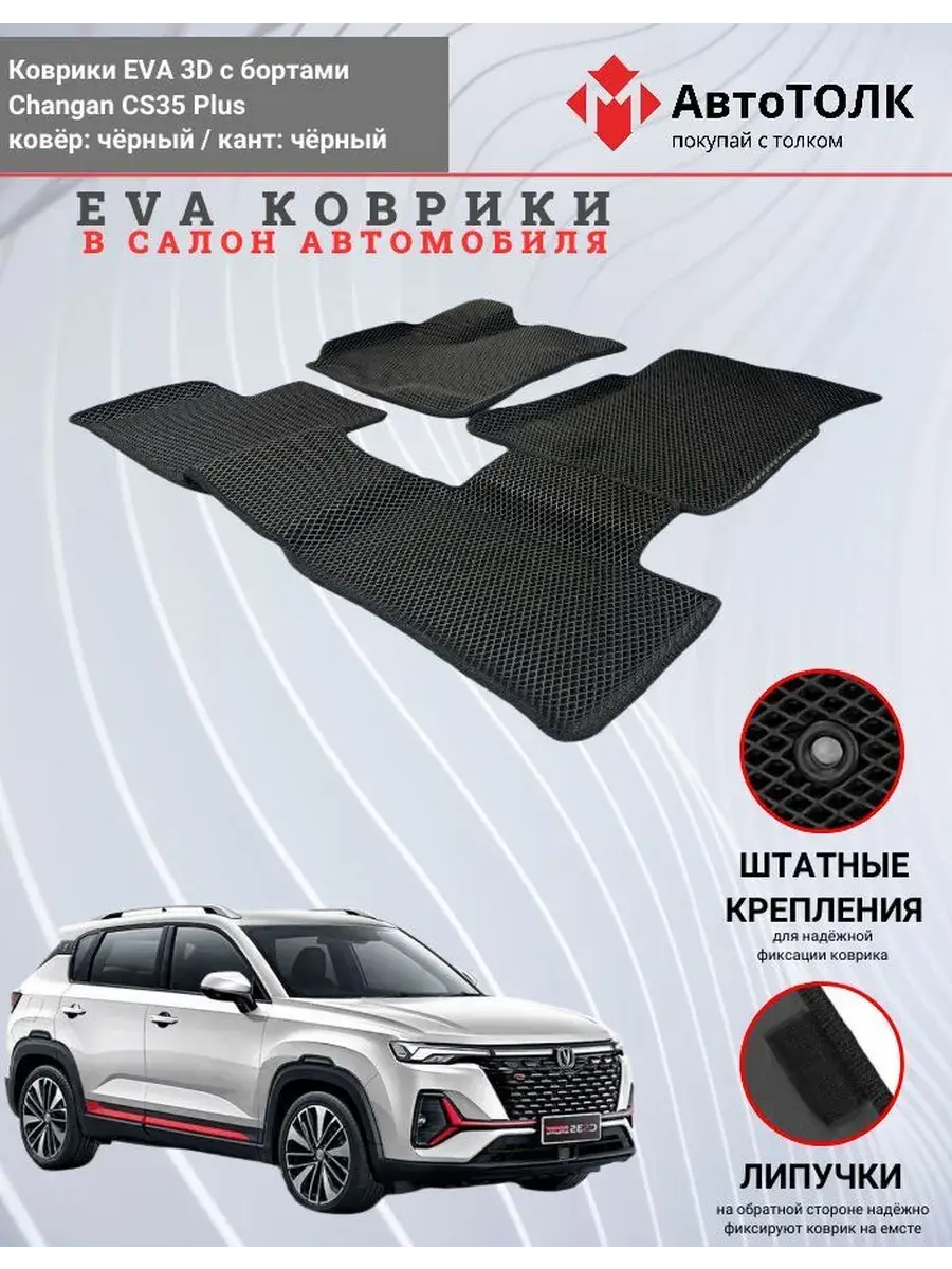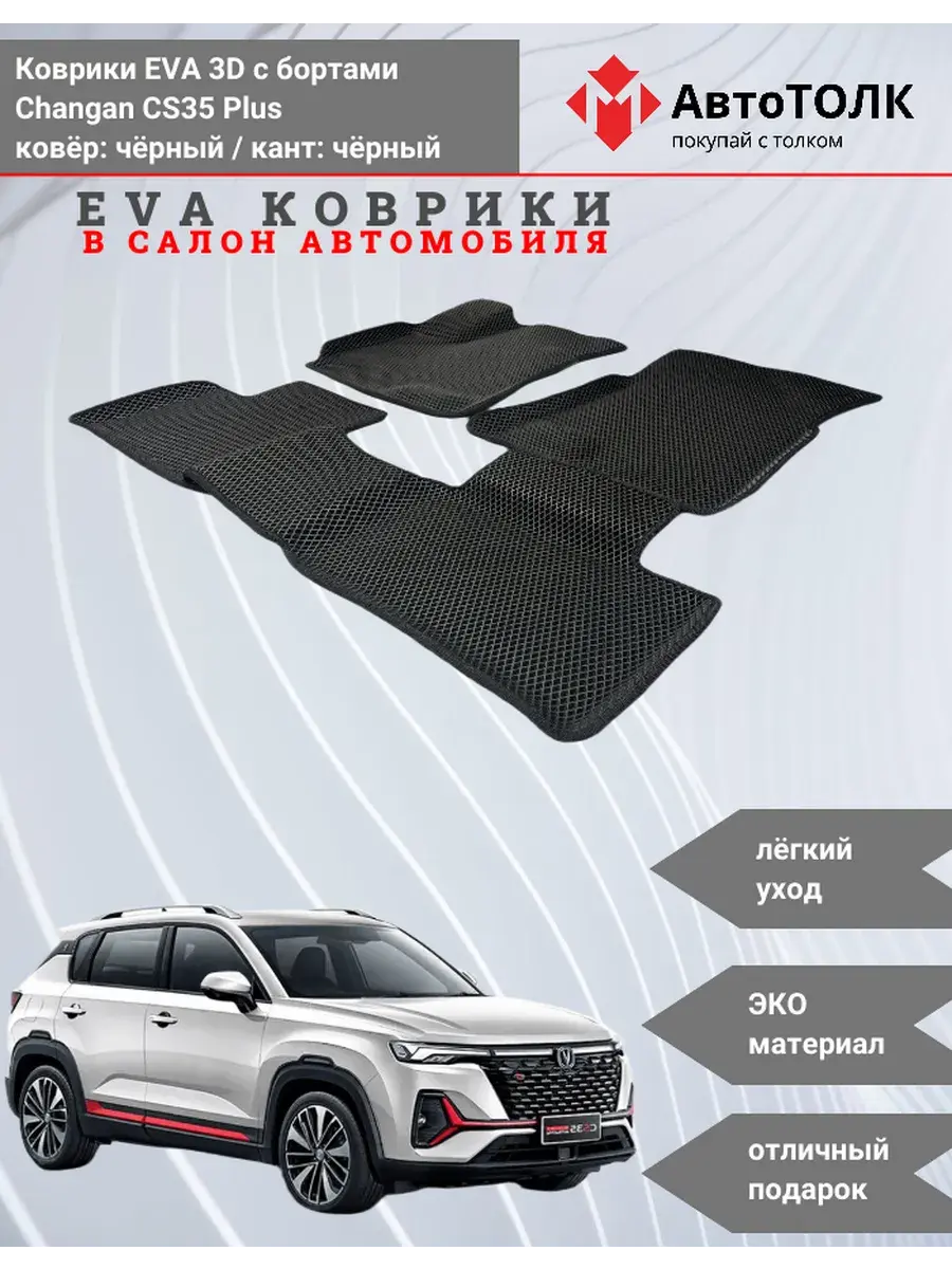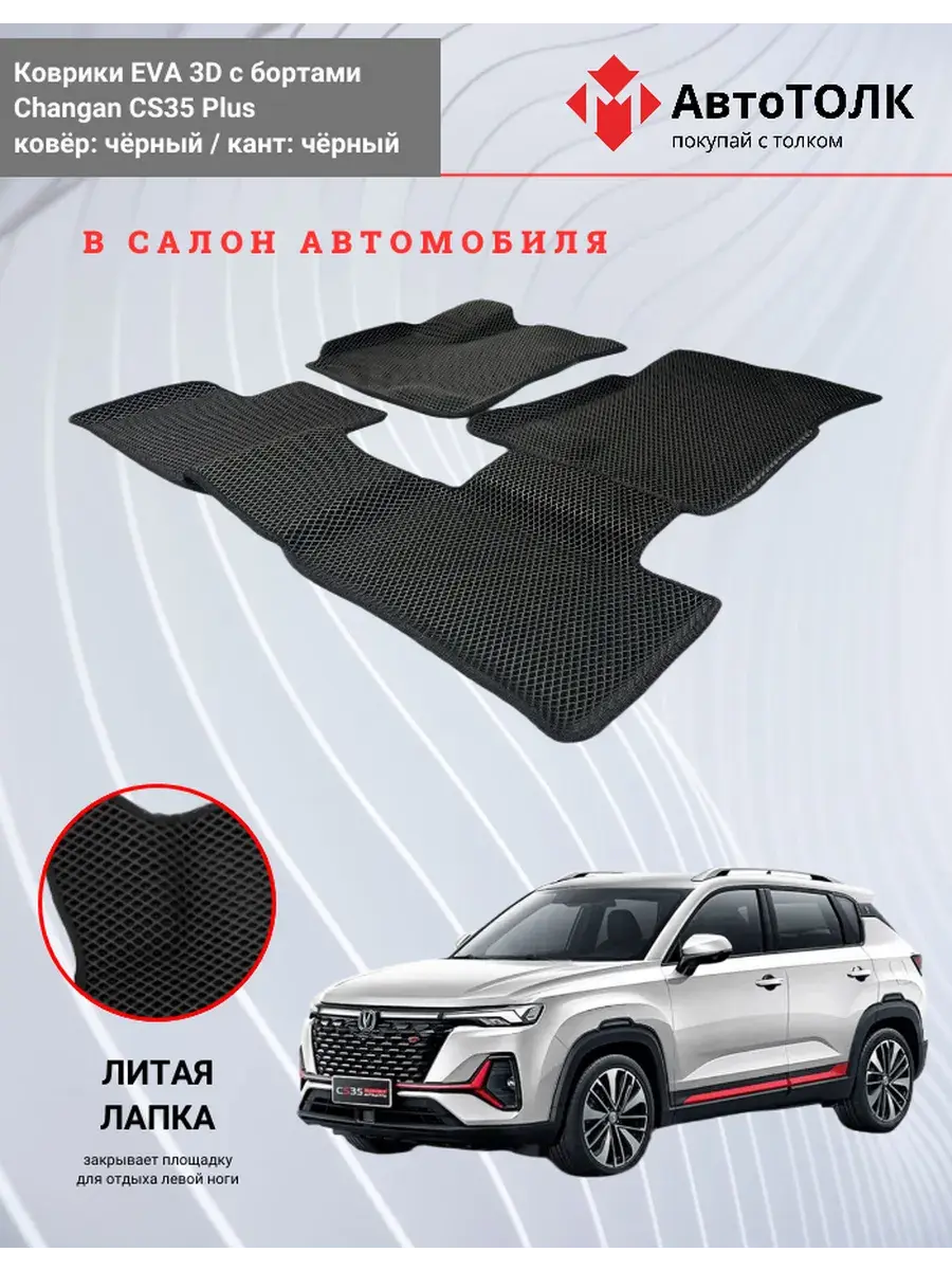 Всесезонные коврики в салон EVA 3D для Changan CS35 Plus, с бортами. Эти коврики обладают формой в точности копирующей рельеф пола автомобиля. Данные коврики изготовлены из материала EVA. Ячеистая (ромбовидная) структура ковриков и высокий бортик не позволяют пыли, грязи, снегу, воде и другой жидкости "убежать" за пределы коврика и испачкать салон автомобиля. Уход в эксплуатации за коврами EVA 3D очень прост и ничем не отличается от ухода за резиновыми коврами. Преимущества: Коврики изготовлены индивидуально на данную модель автомобиля, повторяют все изгибы пола и максимально закрывают штатный ковролин. Все ковры имеют липучки с обратной стороны, для максимальной фиксации. На каждом комплекте устанавливаются оригинальные клипсы (при условии, если они предусмотрены заводом изготовителем) Коврики ЕВА легки в эксплуатации и создают дополнительный комфорт в салоне автомобиля благодаря ячеистой поверхности и упругости материала. ЭВА-коврики удерживают в ячейках грязь, снег и воду, и легко отмываются. Водительский коврик отформован по площадке для отдыха левой ноги и не имеет разреза, за счёт чего грязь не попадает под педальный узел.