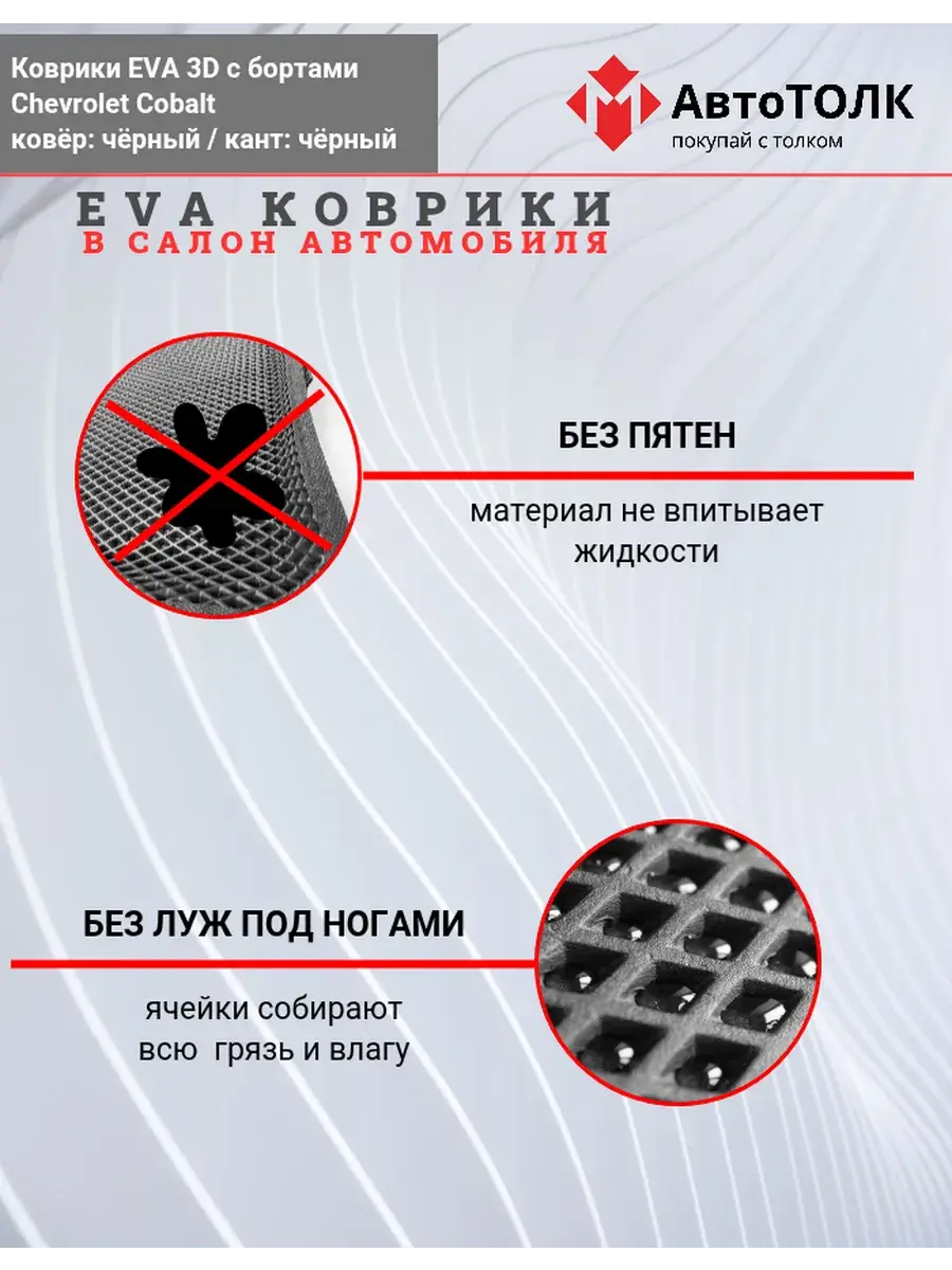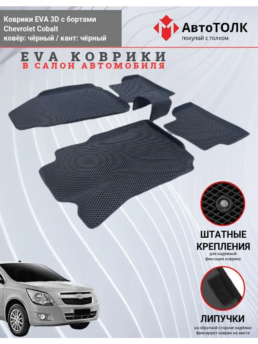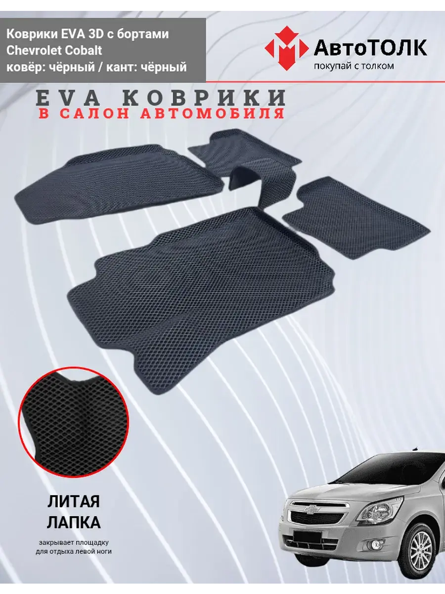 Всесезонные коврики в салон EVA 3D для Chevrolet Cobalt, с бортами. Эти коврики обладают формой в точности копирующей рельеф пола автомобиля. Данные коврики изготовлены из материала EVA. Ячеистая (ромбовидная) структура ковриков и высокий бортик не позволяют пыли, грязи, снегу, воде и другой жидкости "убежать" за пределы коврика и испачкать салон автомобиля. Уход в эксплуатации за коврами EVA 3D очень прост и ничем не отличается от ухода за резиновыми коврами. Преимущества: Коврики изготовлены индивидуально на данную модель автомобиля, повторяют все изгибы пола и максимально закрывают штатный ковролин. Все ковры имеют липучки с обратной стороны, для максимальной фиксации. На каждом комплекте устанавливаются оригинальные клипсы (при условии, если они предусмотрены заводом изготовителем) Коврики ЕВА легки в эксплуатации и создают дополнительный комфорт в салоне автомобиля благодаря ячеистой поверхности и упругости материала. ЭВА-коврики удерживают в ячейках грязь, снег и воду, и легко отмываются. Водительский коврик отформован по площадке для отдыха левой ноги и не имеет разреза, за счёт чего грязь не попадает под педальный узел.