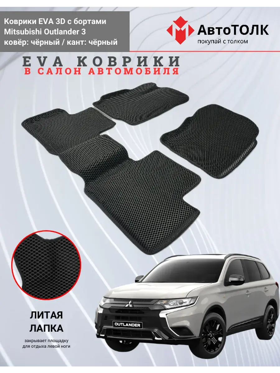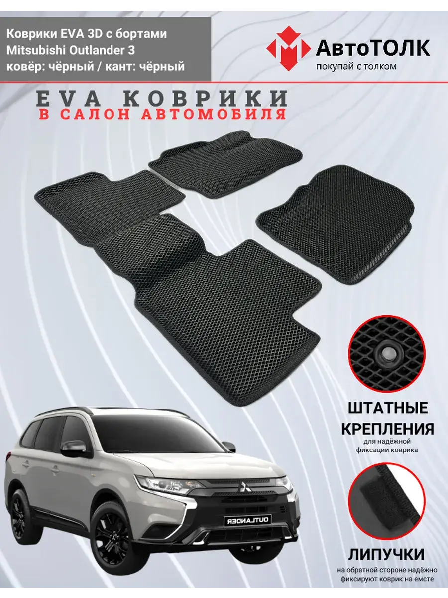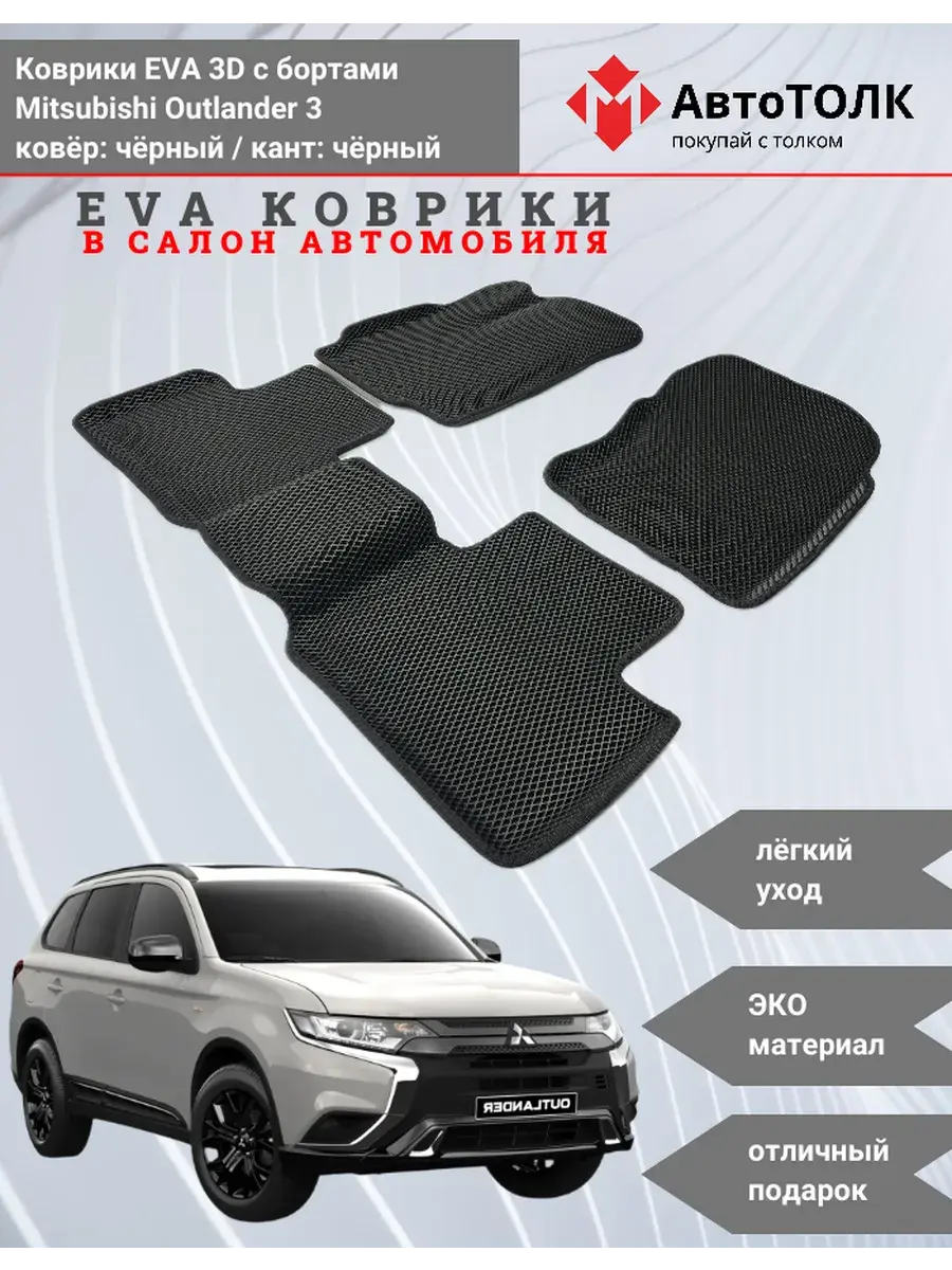 Автомобильные коврики ЕВА (EVA) 3D с бортами для Mitsubishi Outlander 3. Устали от грязи под ногами в вашем автомобиле и постоянных поездок на автомойку? Замените штатные резиновые коврики высокотехнологичными EVA коврами с бортами с традиционной фактурой ромб. В комплект ЭВО ковриков входит: водительский, пассажирский, 2 коврика заднего ряда и перемычка на тоннель.
