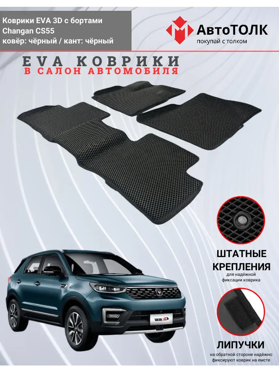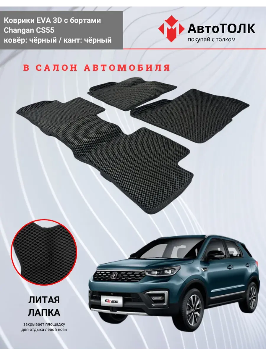 Автомобильные коврики ЕВА (EVA) 3D с бортами для Changan CS55. Устали от грязи под ногами в вашем автомобиле и постоянных поездок на автомойку? Замените штатные резиновые коврики высокотехнологичными EVA коврами с бортами с традиционной фактурой ромб. В комплект ЭВО ковриков входит: водительский, пассажирский, 2 коврика заднего ряда и перемычка на тоннель.