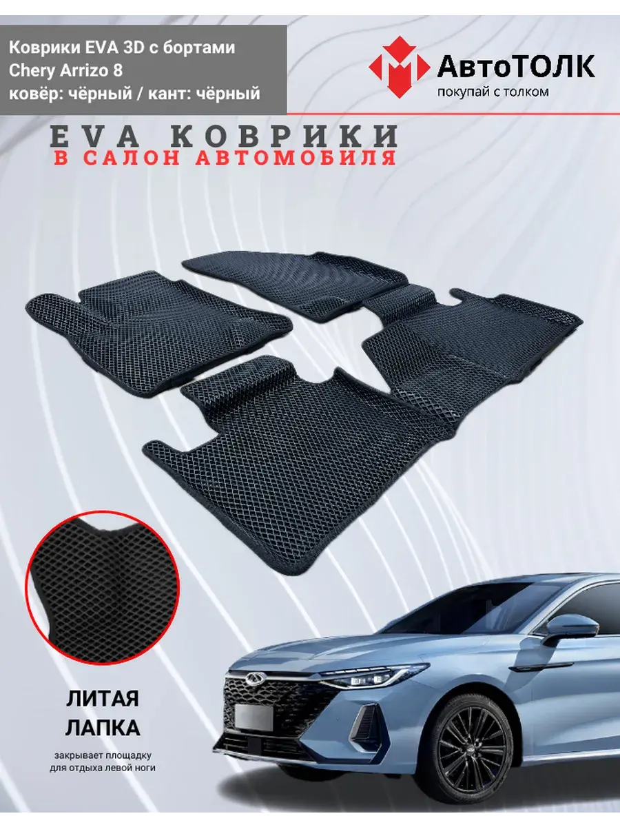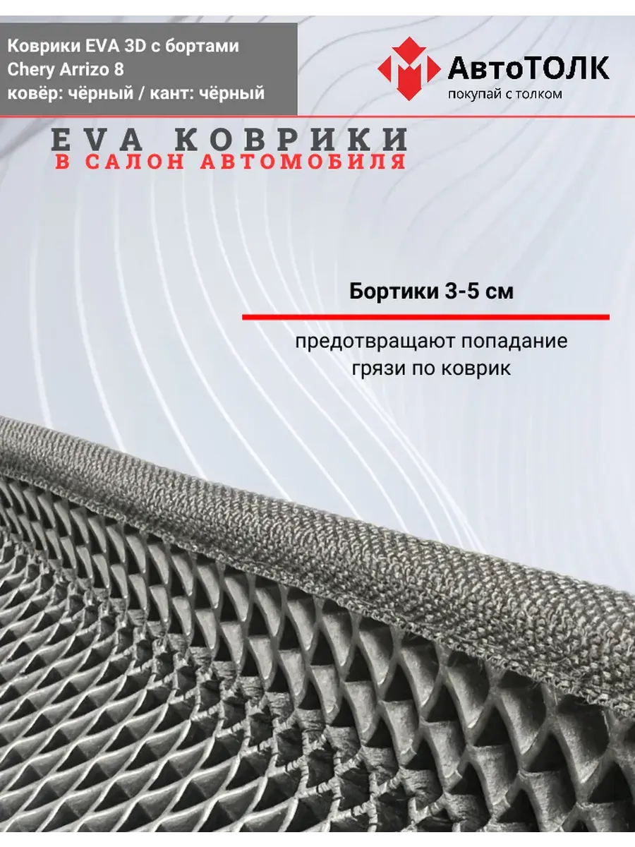Автомобильные коврики ЕВА (EVA) 3D с бортами для Chery Arrizo 8. Устали от грязи под ногами в вашем автомобиле и постоянных поездок на автомойку? Замените штатные резиновые коврики высокотехнологичными EVA коврами с бортами с традиционной фактурой ромб. В комплект ЭВО ковриков входит: водительский, пассажирский, 2 коврика заднего ряда и перемычка на тоннель.