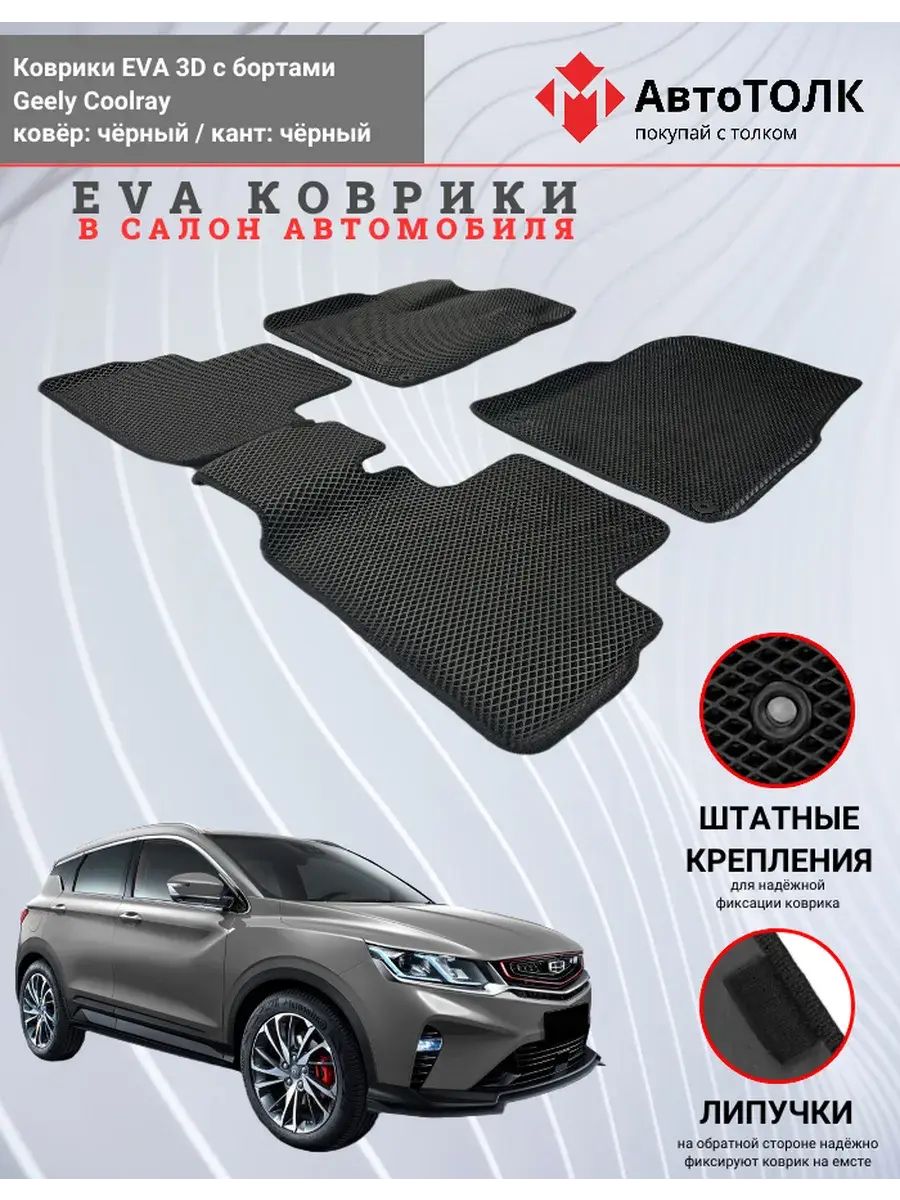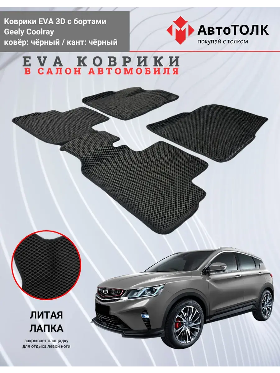 Автомобильные коврики ЕВА (EVA) 3D с бортами для Geely Coolray. Устали от грязи под ногами в вашем автомобиле и постоянных поездок на автомойку? Замените штатные резиновые коврики высокотехнологичными EVA коврами с бортами с традиционной фактурой ромб. В комплект ЭВО ковриков входит: водительский, пассажирский, 2 коврика заднего ряда и перемычка на тоннель.