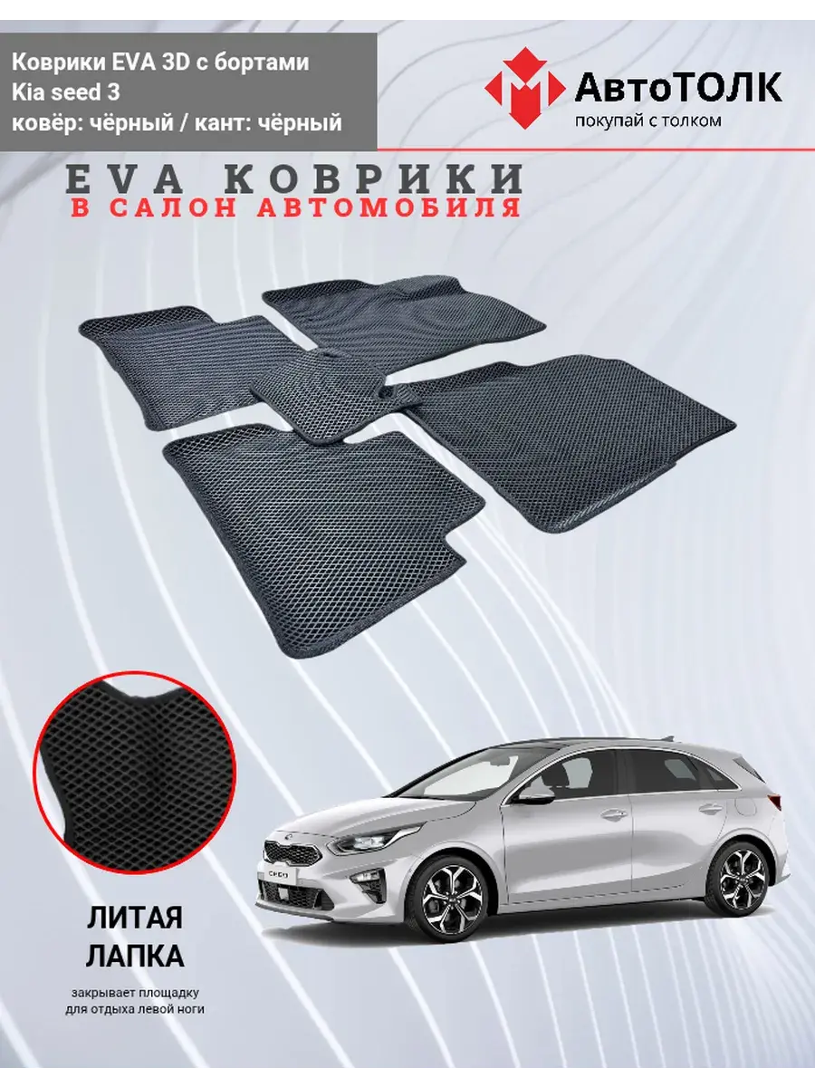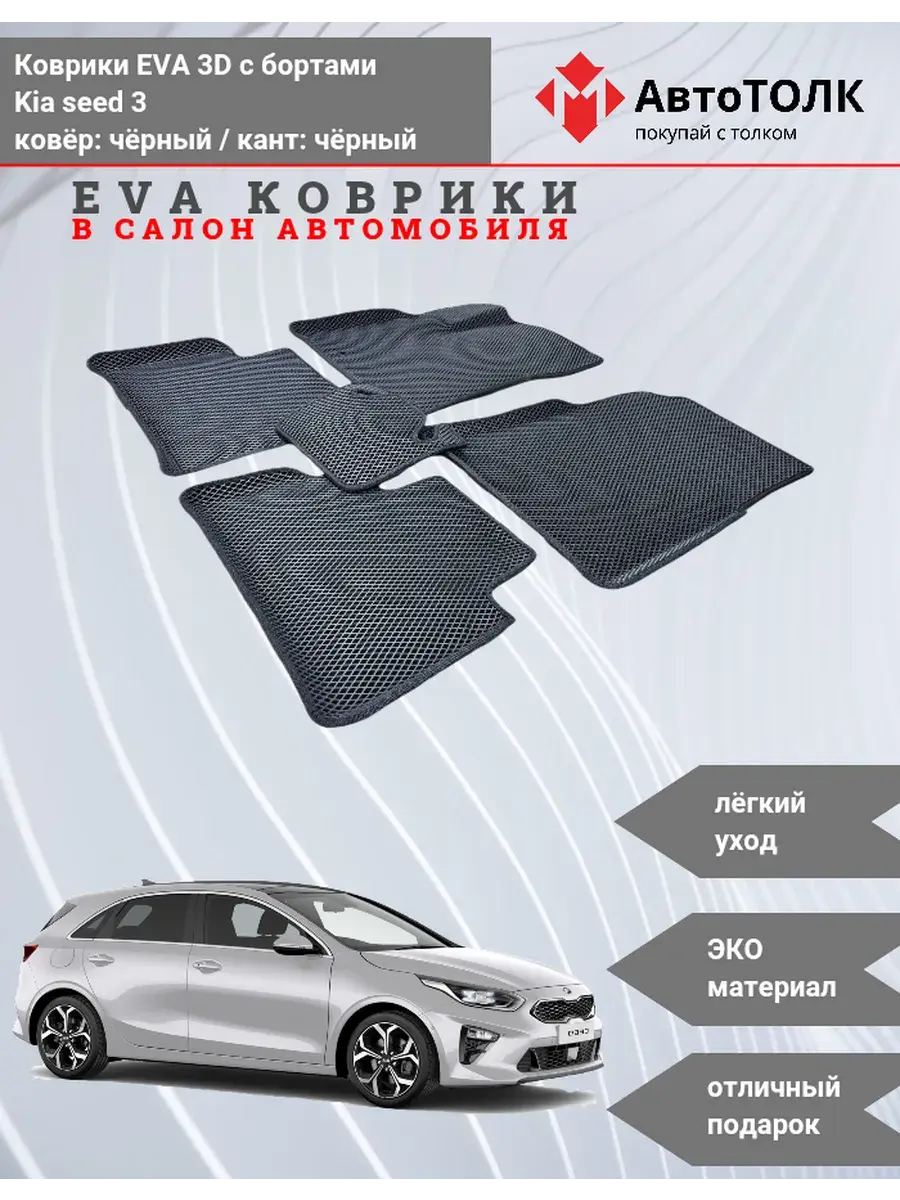Автомобильные коврики ЕВА (EVA) 3D с бортами для KIA seed 3. Устали от грязи под ногами в вашем автомобиле и постоянных поездок на автомойку? Замените штатные резиновые коврики высокотехнологичными EVA коврами с бортами с традиционной фактурой ромб. В комплект ЭВО ковриков входит: водительский, пассажирский, 2 коврика заднего ряда и перемычка на тоннель.