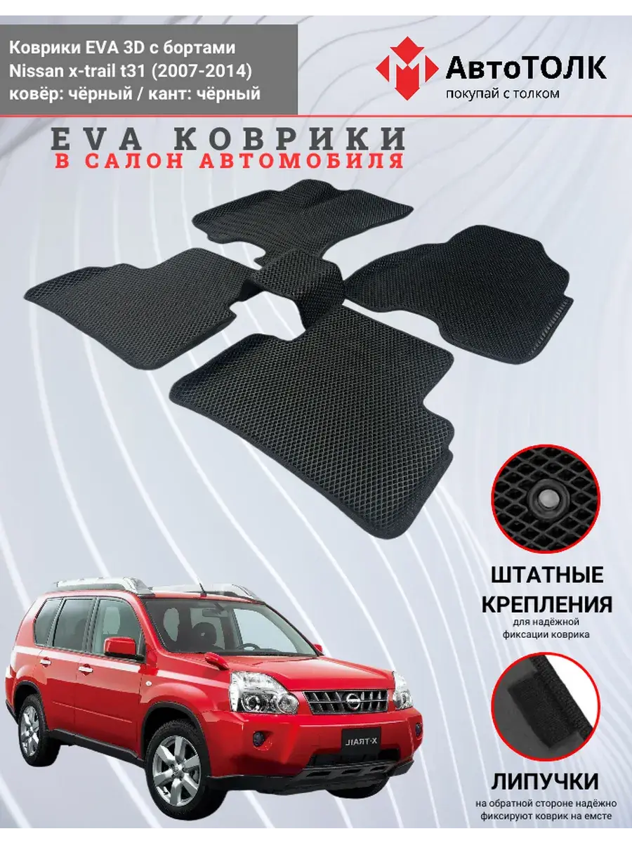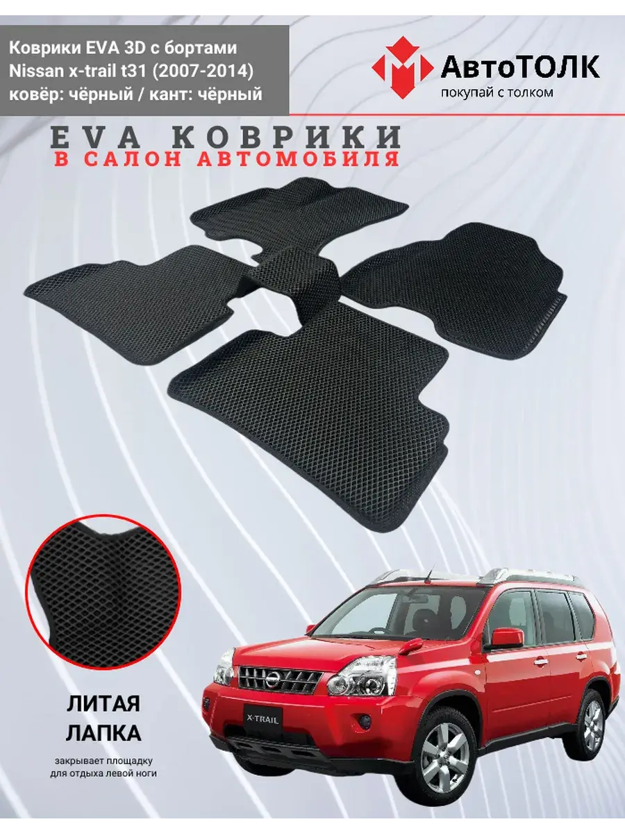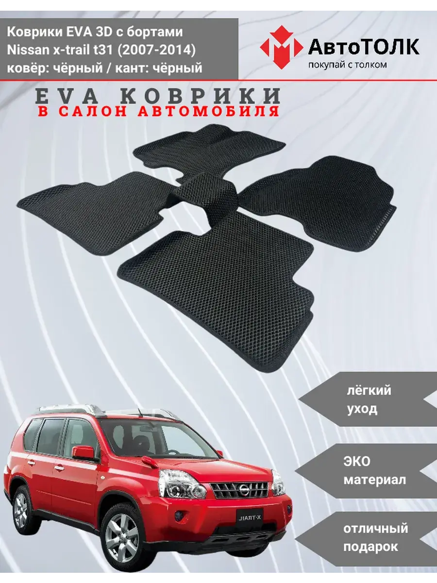Автомобильные коврики ЕВА (EVA) 3D с бортами для Nissan x-trail t31. Устали от грязи под ногами в вашем автомобиле и постоянных поездок на автомойку? Замените штатные резиновые коврики высокотехнологичными EVA коврами с бортами с традиционной фактурой ромб. В комплект ЭВО ковриков входит: водительский, пассажирский, 2 коврика заднего ряда и перемычка на тоннель.