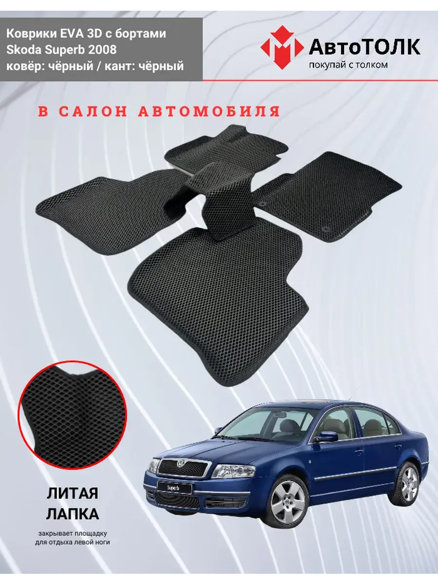 Автомобильные коврики ЕВА (EVA) 3D с бортами для Skoda Superb 2008. Устали от грязи под ногами в вашем автомобиле и постоянных поездок на автомойку? Замените штатные резиновые коврики высокотехнологичными EVA коврами с бортами с традиционной фактурой ромб. В комплект ЭВО ковриков входит: водительский, пассажирский, 2 коврика заднего ряда и перемычка на тоннель.