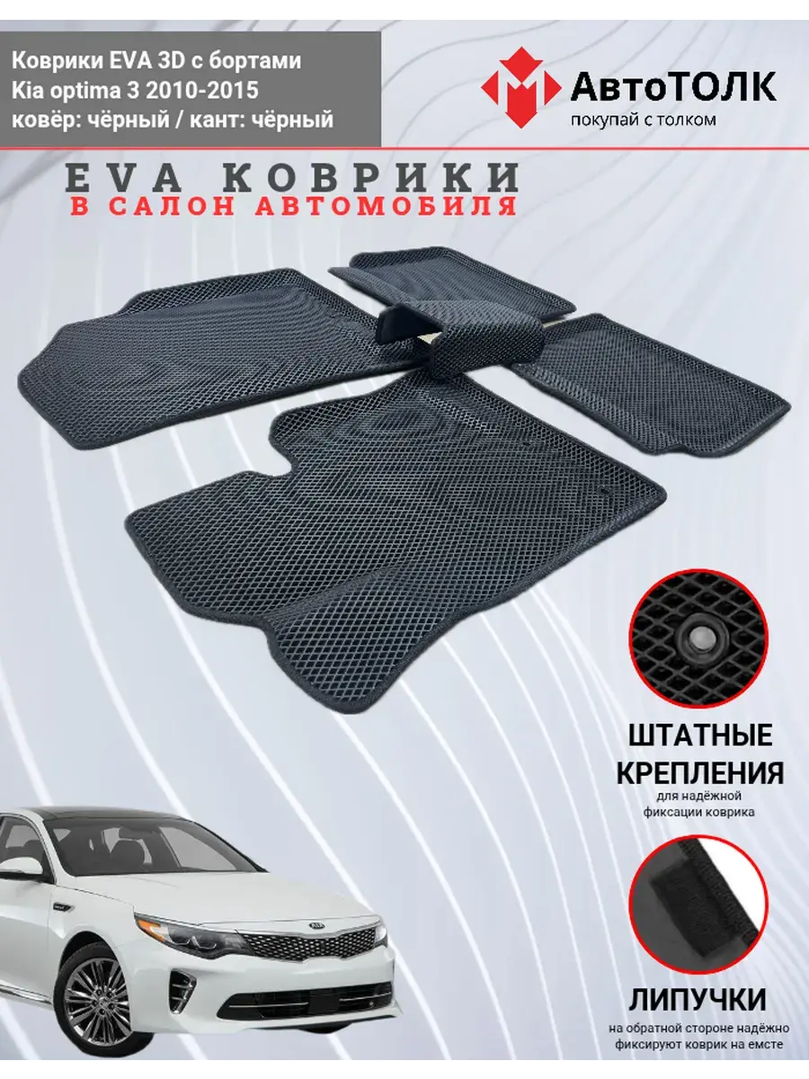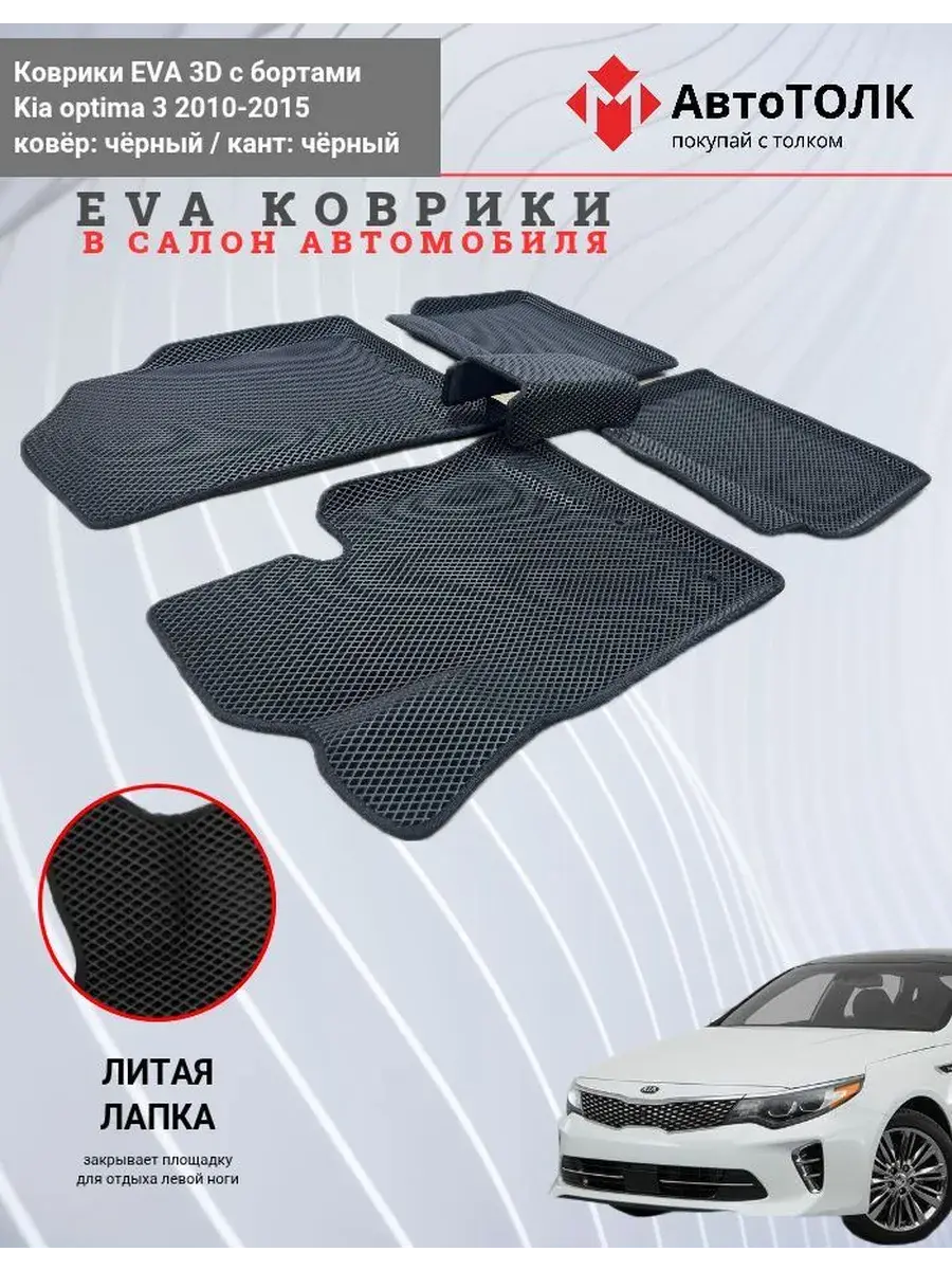 Всесезонные коврики в салон EVA 3D для Kia optima 3, с бортами. Эти коврики обладают формой в точности копирующей рельеф пола автомобиля. Данные коврики изготовлены из материала EVA. Ячеистая (ромбовидная) структура ковриков и высокий бортик не позволяют пыли, грязи, снегу, воде и другой жидкости "убежать" за пределы коврика и испачкать салон автомобиля. Уход в эксплуатации за коврами EVA 3D очень прост и ничем не отличается от ухода за резиновыми коврами. Преимущества: Коврики изготовлены индивидуально на данную модель автомобиля, повторяют все изгибы пола и максимально закрывают штатный ковролин. Все ковры имеют липучки с обратной стороны, для максимальной фиксации. На каждом комплекте устанавливаются оригинальные клипсы (при условии, если они предусмотрены заводом изготовителем) Коврики ЕВА легки в эксплуатации и создают дополнительный комфорт в салоне автомобиля благодаря ячеистой поверхности и упругости материала. ЭВА-коврики удерживают в ячейках грязь, снег и воду, и легко отмываются. Водительский коврик отформован по площадке для отдыха левой ноги и не имеет разреза, за счёт чего грязь не попадает под педальный узел.