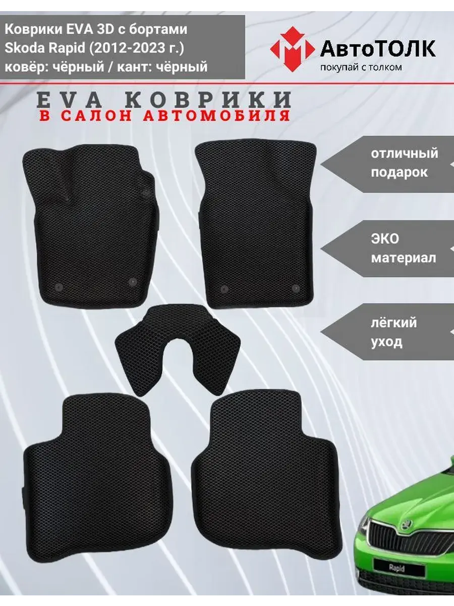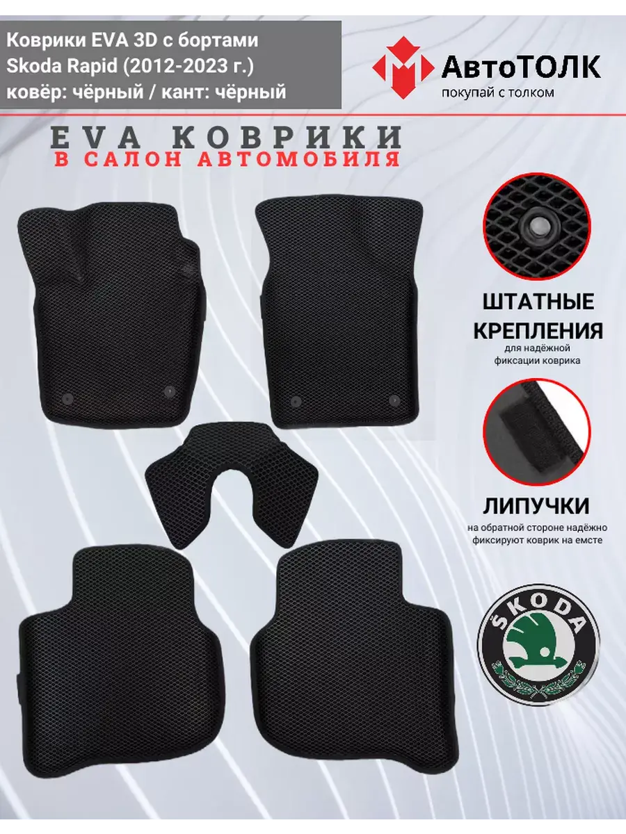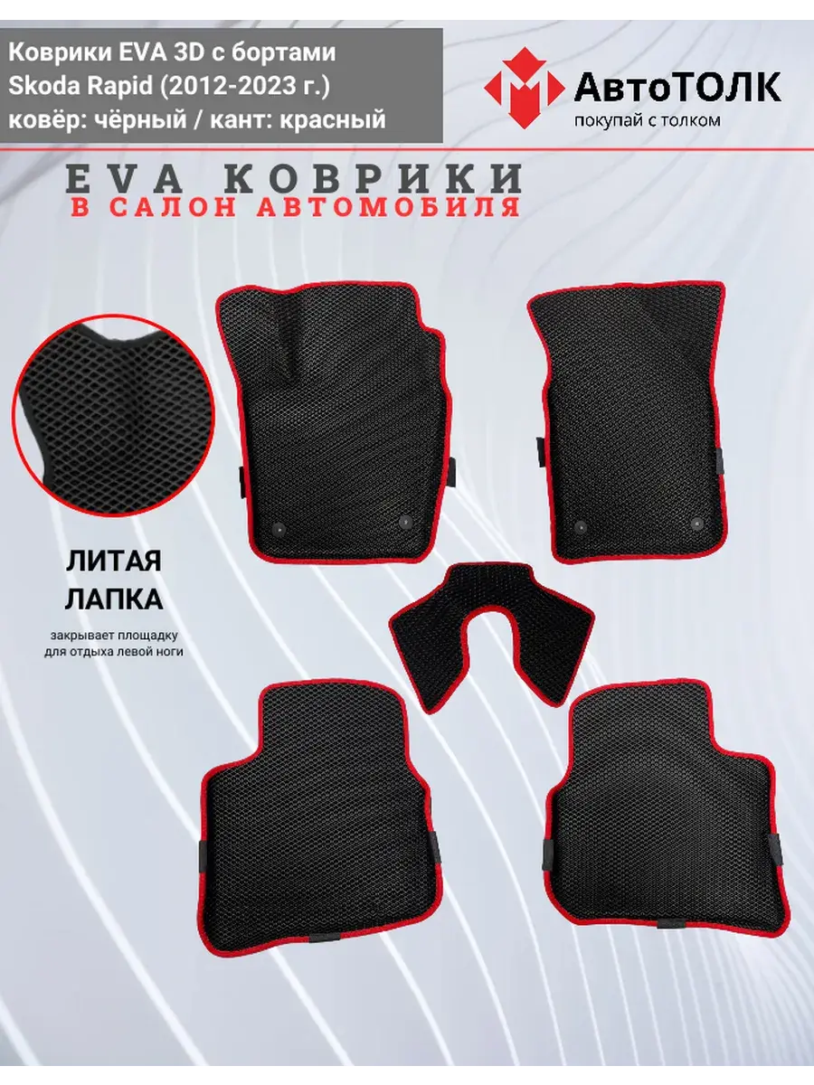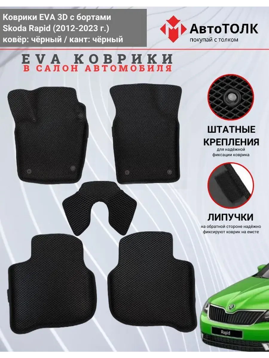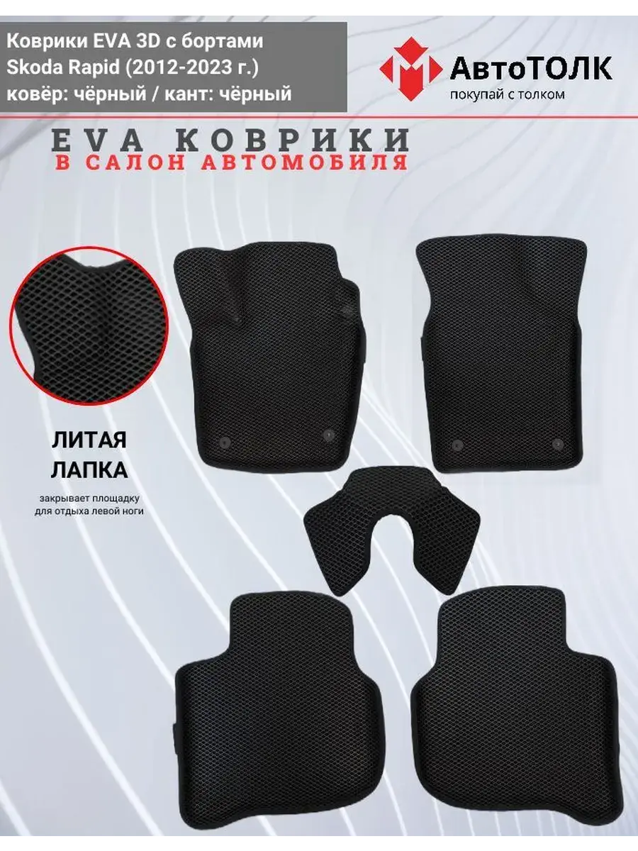 Всесезонные коврики в салон EVA 3D для SKODA Rapid 1, 2 (2013-2020), с бортами. Эти коврики обладают формой в точности копирующей рельеф пола автомобиля. Данные коврики изготовлены из материала EVA. Ячеистая (ромбовидная) структура ковриков и высокий бортик не позволяют пыли, грязи, снегу, воде и другой жидкости "убежать" за пределы коврика и испачкать салон автомобиля. Уход в эксплуатации за коврами EVA 3D очень прост и ничем не отличается от ухода за резиновыми коврами. Преимущества: • Коврики изготовлены индивидуально на данную модель автомобиля, повторяют все изгибы пола и максимально закрывают штатный ковролин. • Все ковры имеют липучки с обратной стороны, для максимальной фиксации. На каждом комплекте устанавливаются оригинальные клипсы (при условии, если они предусмотрены заводом изготовителем) • Коврики ЕВА легки в эксплуатации и создают дополнительный комфорт в салоне автомобиля благодаря ячеистой поверхности и упругости материала. ЭВА-коврики удерживают в ячейках грязь, снег и воду, и легко отмываются. • Водительский коврик отформован по площадке для отдыха левой ноги и не имеет разреза, за счёт чего грязь не попадает под педальный узел.