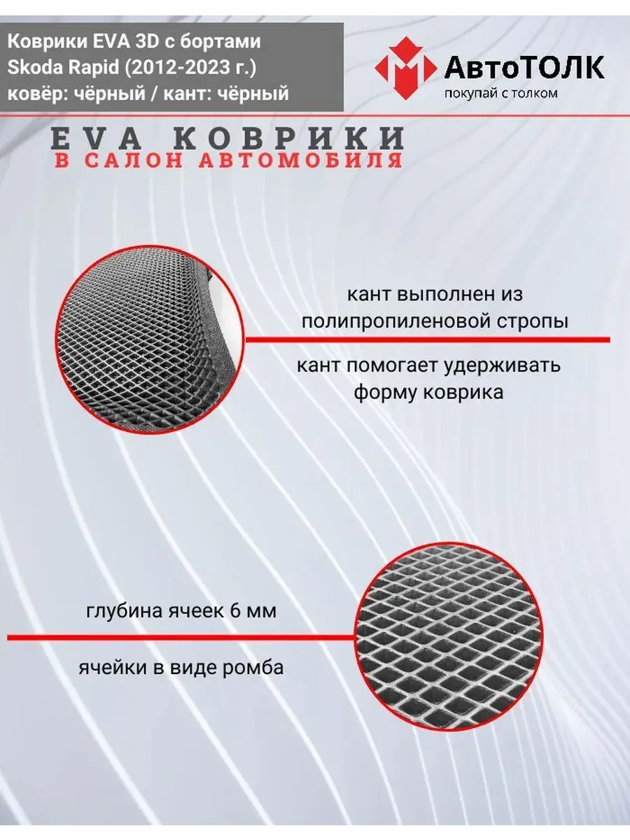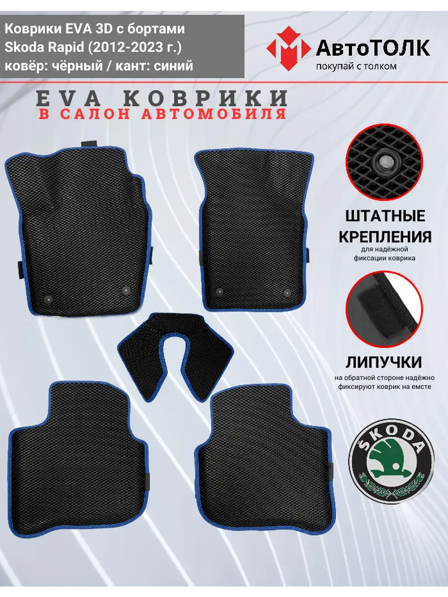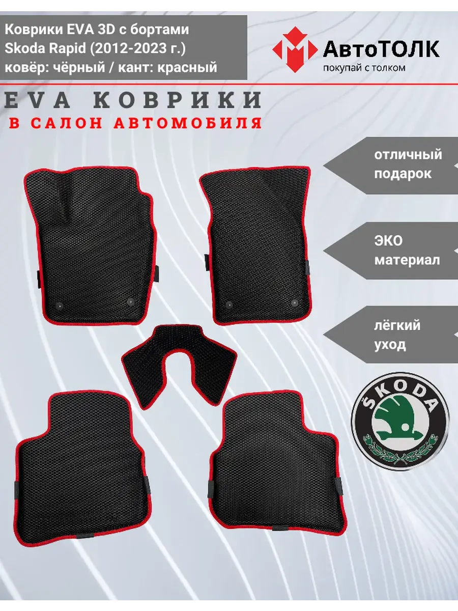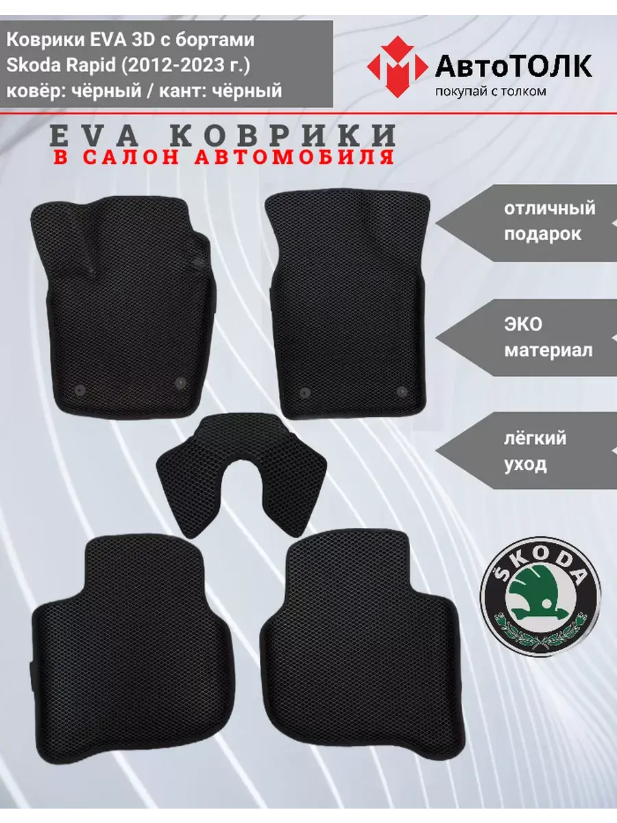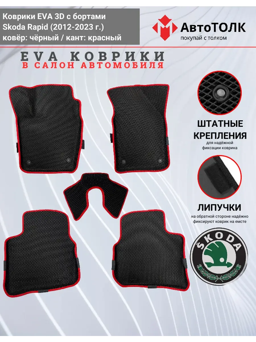Всесезонные коврики в салон EVA 3D для SKODA Rapid 1, 2 (2013-2020), с бортами. Эти коврики обладают формой в точности копирующей рельеф пола автомобиля. Данные коврики изготовлены из материала EVA. Ячеистая (ромбовидная) структура ковриков и высокий бортик не позволяют пыли, грязи, снегу, воде и другой жидкости "убежать" за пределы коврика и испачкать салон автомобиля. Уход в эксплуатации за коврами EVA 3D очень прост и ничем не отличается от ухода за резиновыми коврами. Преимущества: • Коврики изготовлены индивидуально на данную модель автомобиля, повторяют все изгибы пола и максимально закрывают штатный ковролин. • Все ковры имеют липучки с обратной стороны, для максимальной фиксации. На каждом комплекте устанавливаются оригинальные клипсы (при условии, если они предусмотрены заводом изготовителем) • Коврики ЕВА легки в эксплуатации и создают дополнительный комфорт в салоне автомобиля благодаря ячеистой поверхности и упругости материала. ЭВА-коврики удерживают в ячейках грязь, снег и воду, и легко отмываются. • Водительский коврик отформован по площадке для отдыха левой ноги и не имеет разреза, за счёт чего грязь не попадает под педальный узел.