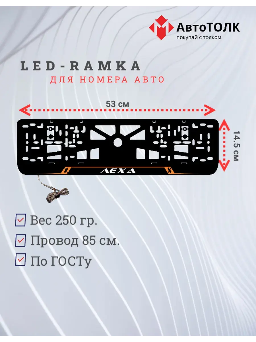 Ищете стильное и практичное обновление для вашего автомобиля? Рамка для номера с LED подсветкой надписи от бренда АвтоТОЛК — именно то, что вам нужно! Это инновационное решение не только придаст вашему автомобилю современный вид, но и повысит его заметность на дороге. Яркая ЛЭД рамка под номер обеспечивает четкое и равномерное освещение, что гарантирует отличную видимость вашего государственного номера в любое время суток и при любых погодных условиях. За счет использования высококачественных LED элементов, рамка отличается длительным сроком службы. Номерная рамка с вашим лого или логотипом торговой марки станет оригинальным дополнением, подчеркивающим индивидуальность вашего авто. Устанавливать рамки с LED подсветкой легко и удобно, они совместимы со стандартными номерными знаками и не требуют специальных навыков для монтажа. Независимо от того, выбираете ли вы рамки с ЛЭД подсветкой для себя или в подарок автолюбителю, этот автоаксессуар станет надежным и стильным приобретением. Тонкий, но прочный корпус рамки выполнен из высококачественных материалов, что обеспечивает устойчивость к механическим повреждениям, влаге и неблагоприятным погодным условиям. Обновите внешний вид своего автомобиля с применением современных технологий — номерные рамки с LED подсветкой от АвтоТОЛК это комбинация стиля, удобства и безопасности.