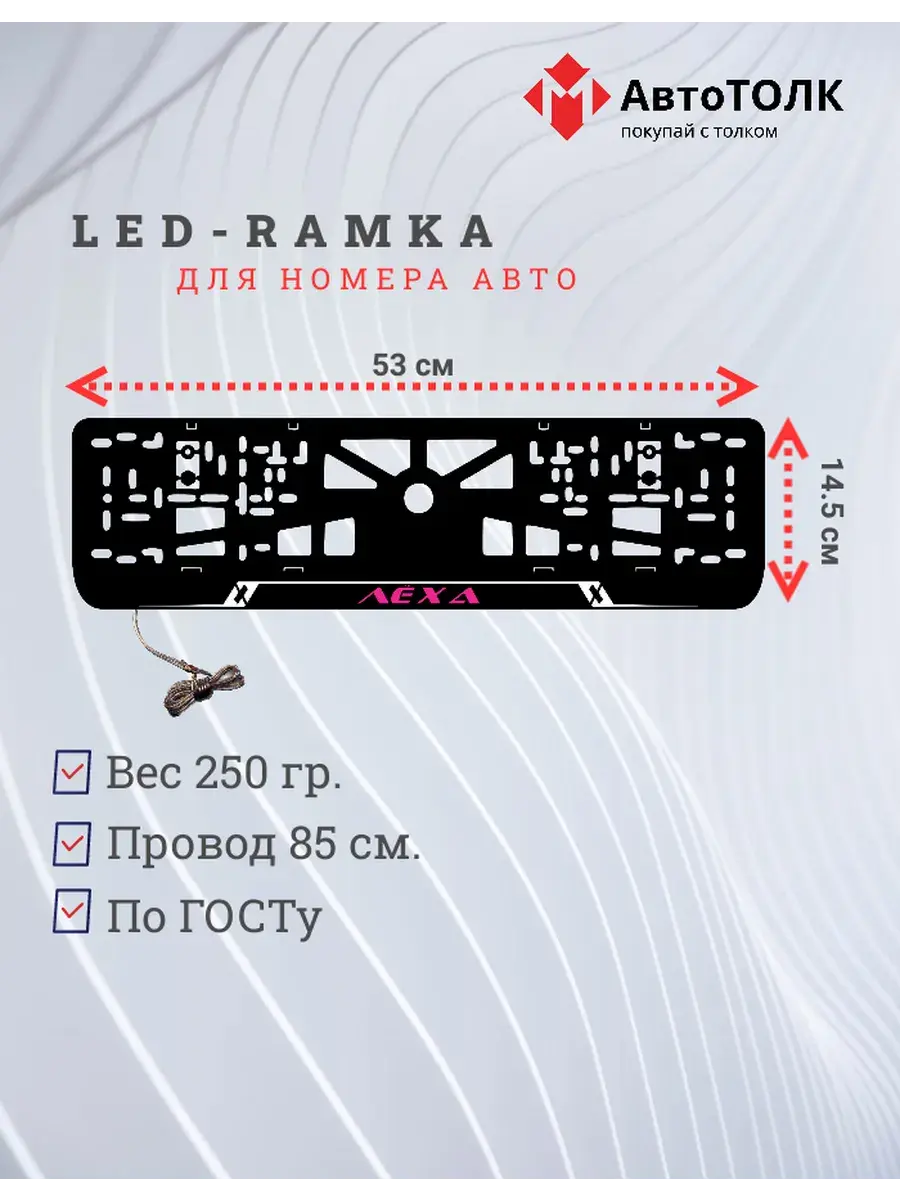 Ищете стильное и практичное обновление для вашего автомобиля? Рамка для номера с LED подсветкой надписи от бренда АвтоТОЛК — именно то, что вам нужно! Это инновационное решение не только придаст вашему автомобилю современный вид, но и повысит его заметность на дороге. Яркая ЛЭД рамка под номер обеспечивает четкое и равномерное освещение, что гарантирует отличную видимость вашего государственного номера в любое время суток и при любых погодных условиях. За счет использования высококачественных LED элементов, рамка отличается длительным сроком службы. Номерная рамка с вашим лого или логотипом торговой марки станет оригинальным дополнением, подчеркивающим индивидуальность вашего авто. Устанавливать рамки с LED подсветкой легко и удобно, они совместимы со стандартными номерными знаками и не требуют специальных навыков для монтажа. Независимо от того, выбираете ли вы рамки с ЛЭД подсветкой для себя или в подарок автолюбителю, этот автоаксессуар станет надежным и стильным приобретением. Тонкий, но прочный корпус рамки выполнен из высококачественных материалов, что обеспечивает устойчивость к механическим повреждениям, влаге и неблагоприятным погодным условиям. Обновите внешний вид своего автомобиля с применением современных технологий — номерные рамки с LED подсветкой от АвтоТОЛК это комбинация стиля, удобства и безопасности.