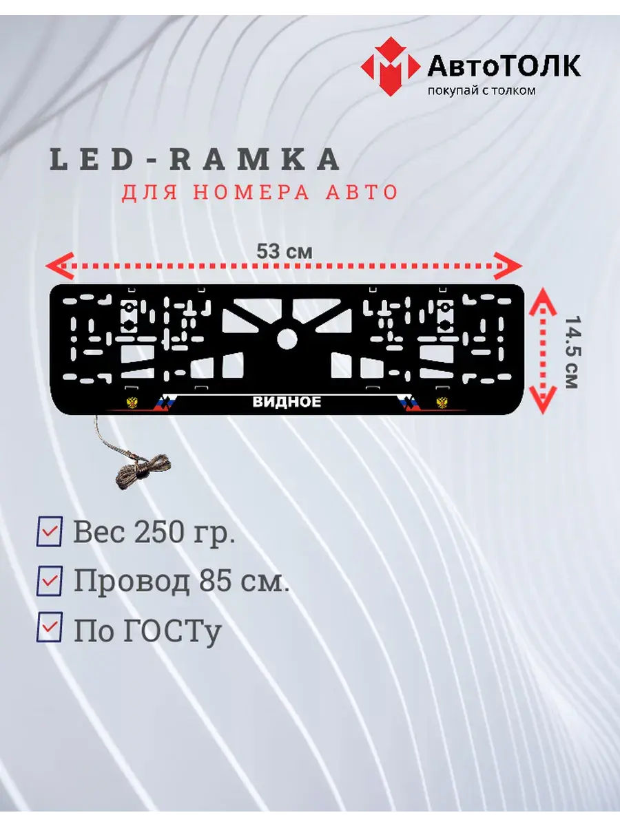 Ищете стильное и практичное обновление для вашего автомобиля? Рамка для номера с LED подсветкой надписи от бренда АвтоТОЛК — именно то, что вам нужно! Это инновационное решение не только придаст вашему автомобилю современный вид, но и повысит его заметность на дороге. Яркая ЛЭД рамка под номер обеспечивает четкое и равномерное освещение, что гарантирует отличную видимость вашего государственного номера в любое время суток и при любых погодных условиях. За счет использования высококачественных LED элементов, рамка отличается длительным сроком службы. Номерная рамка с вашим лого или логотипом торговой марки станет оригинальным дополнением, подчеркивающим индивидуальность вашего авто. Устанавливать рамки с LED подсветкой легко и удобно, они совместимы со стандартными номерными знаками и не требуют специальных навыков для монтажа. Независимо от того, выбираете ли вы рамки с ЛЭД подсветкой для себя или в подарок автолюбителю, этот автоаксессуар станет надежным и стильным приобретением. Тонкий, но прочный корпус рамки выполнен из высококачественных материалов, что обеспечивает устойчивость к механическим повреждениям, влаге и неблагоприятным погодным условиям. Обновите внешний вид своего автомобиля с применением современных технологий — номерные рамки с LED подсветкой от АвтоТОЛК это комбинация стиля, удобства и безопасности.