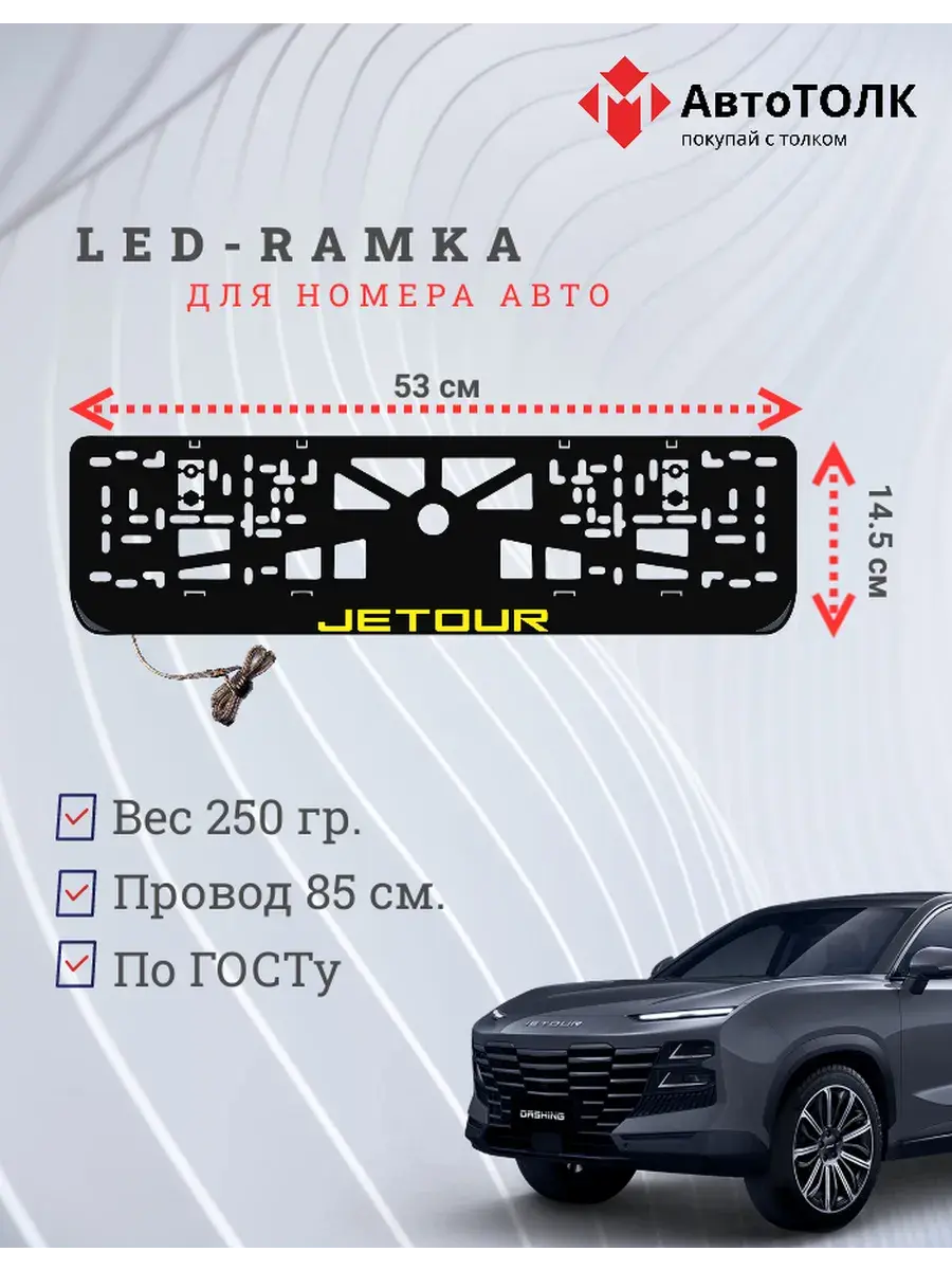 Ищете стильное и практичное обновление для вашего автомобиля? Рамка для номера с LED подсветкой надписи от бренда АвтоТОЛК — именно то, что вам нужно! Это инновационное решение не только придаст вашему автомобилю современный вид, но и повысит его заметность на дороге. Яркая ЛЭД рамка под номер обеспечивает четкое и равномерное освещение, что гарантирует отличную видимость вашего государственного номера в любое время суток и при любых погодных условиях. За счет использования высококачественных LED элементов, рамка отличается длительным сроком службы. Номерная рамка с вашим лого или логотипом торговой марки станет оригинальным дополнением, подчеркивающим индивидуальность вашего авто. Устанавливать рамки с LED подсветкой легко и удобно, они совместимы со стандартными номерными знаками и не требуют специальных навыков для монтажа. Независимо от того, выбираете ли вы рамки с ЛЭД подсветкой для себя или в подарок автолюбителю, этот автоаксессуар станет надежным и стильным приобретением. Тонкий, но прочный корпус рамки выполнен из высококачественных материалов, что обеспечивает устойчивость к механическим повреждениям, влаге и неблагоприятным погодным условиям. Обновите внешний вид своего автомобиля с применением современных технологий — номерные рамки с LED подсветкой от АвтоТОЛК это комбинация стиля, удобства и безопасности.