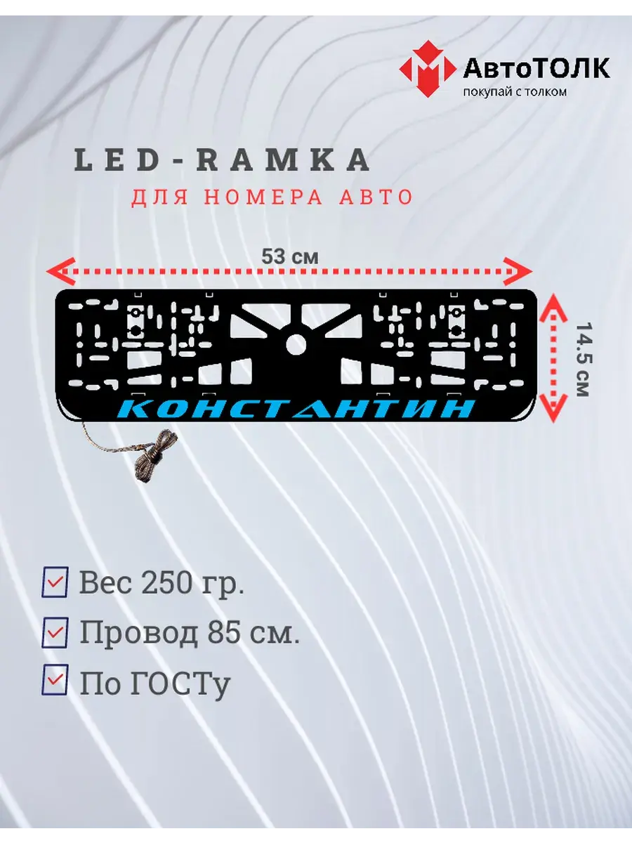 Ищете стильное и практичное обновление для вашего автомобиля? Рамка для номера с LED подсветкой надписи от бренда АвтоТОЛК — именно то, что вам нужно! Это инновационное решение не только придаст вашему автомобилю современный вид, но и повысит его заметность на дороге. Яркая ЛЭД рамка под номер обеспечивает четкое и равномерное освещение, что гарантирует отличную видимость вашего государственного номера в любое время суток и при любых погодных условиях. За счет использования высококачественных LED элементов, рамка отличается длительным сроком службы. Номерная рамка с вашим лого или логотипом торговой марки станет оригинальным дополнением, подчеркивающим индивидуальность вашего авто. Устанавливать рамки с LED подсветкой легко и удобно, они совместимы со стандартными номерными знаками и не требуют специальных навыков для монтажа. Независимо от того, выбираете ли вы рамки с ЛЭД подсветкой для себя или в подарок автолюбителю, этот автоаксессуар станет надежным и стильным приобретением. Тонкий, но прочный корпус рамки выполнен из высококачественных материалов, что обеспечивает устойчивость к механическим повреждениям, влаге и неблагоприятным погодным условиям. Обновите внешний вид своего автомобиля с применением современных технологий — номерные рамки с LED подсветкой от АвтоТОЛК это комбинация стиля, удобства и безопасности.